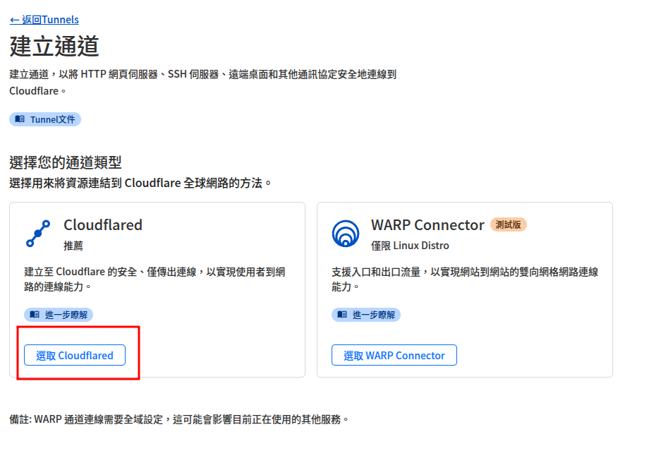 在使用內網穿透功能中主要使用的 Tunnel,比較像是作為服務端,連上 Cloudflare 網路來提供服務,但也不止可以提供內網穿透的功能,可以透過 cloudflared 實現 WARP 提供的部分功能。