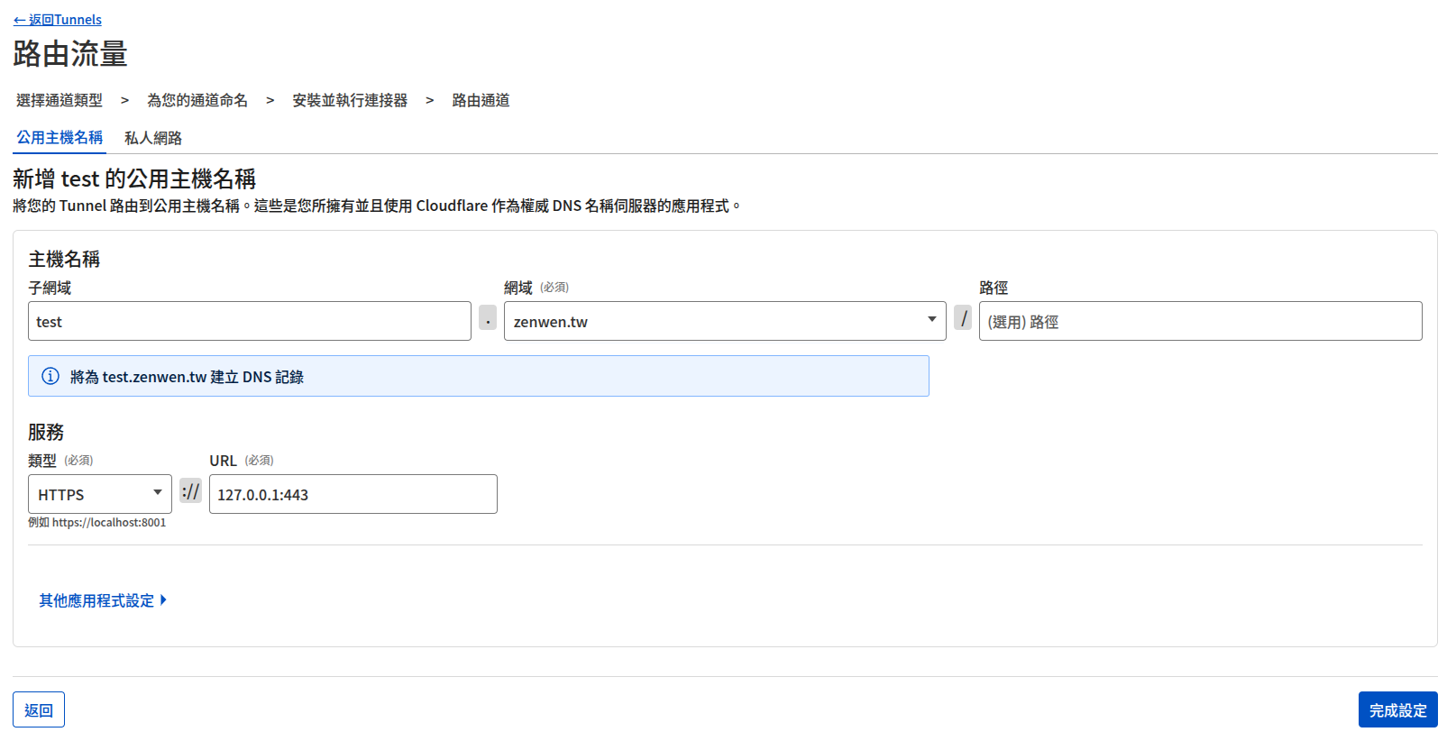 上排的子網域和主機名稱就是可以被 Public Network 訪問到的端點,需要至少有一個在 Cloudflare 上的網域。