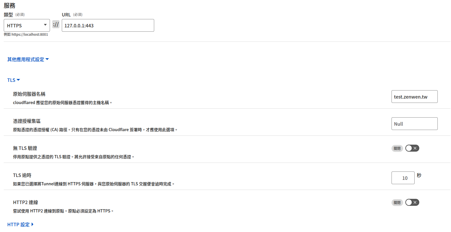 如果是想穿透到內部的 Nginx 上,為了要拿到正確的 TLS certificate,需要在 TLS 的部分設定要代理的域名,這樣 Nginx 才會返回正確的證書和網頁,如果是代理 HTTP 或是設定忽略證書,可以改為設定 HTTP 設定中的 HTTP 主機標頭(Host Header)的部分
