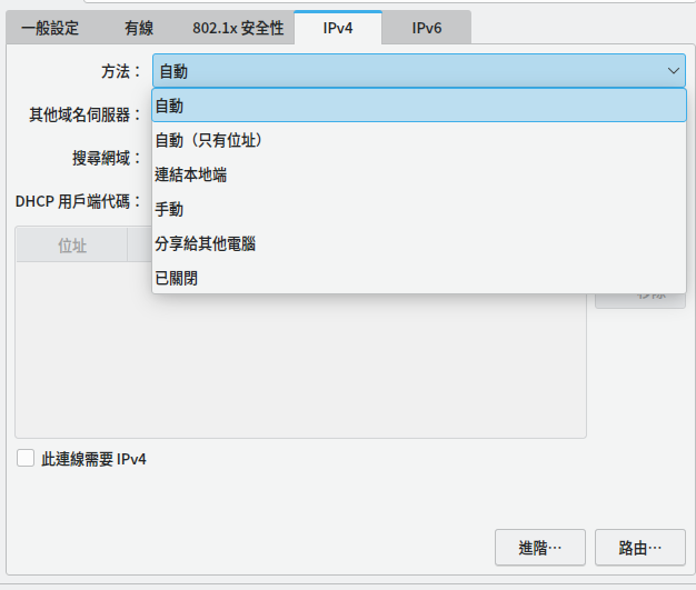 其實這樣做還是會有一個漏洞,如果你不信任的 DHCP server 有設定 DNS domain,那麼 systemd-resolved 一樣會吃到這個設定,解決的方法就是把 Network Manager 的那個網路連接設定為使用 DHCP(Address only) ,但是這樣就要手動設定,有點不爽。