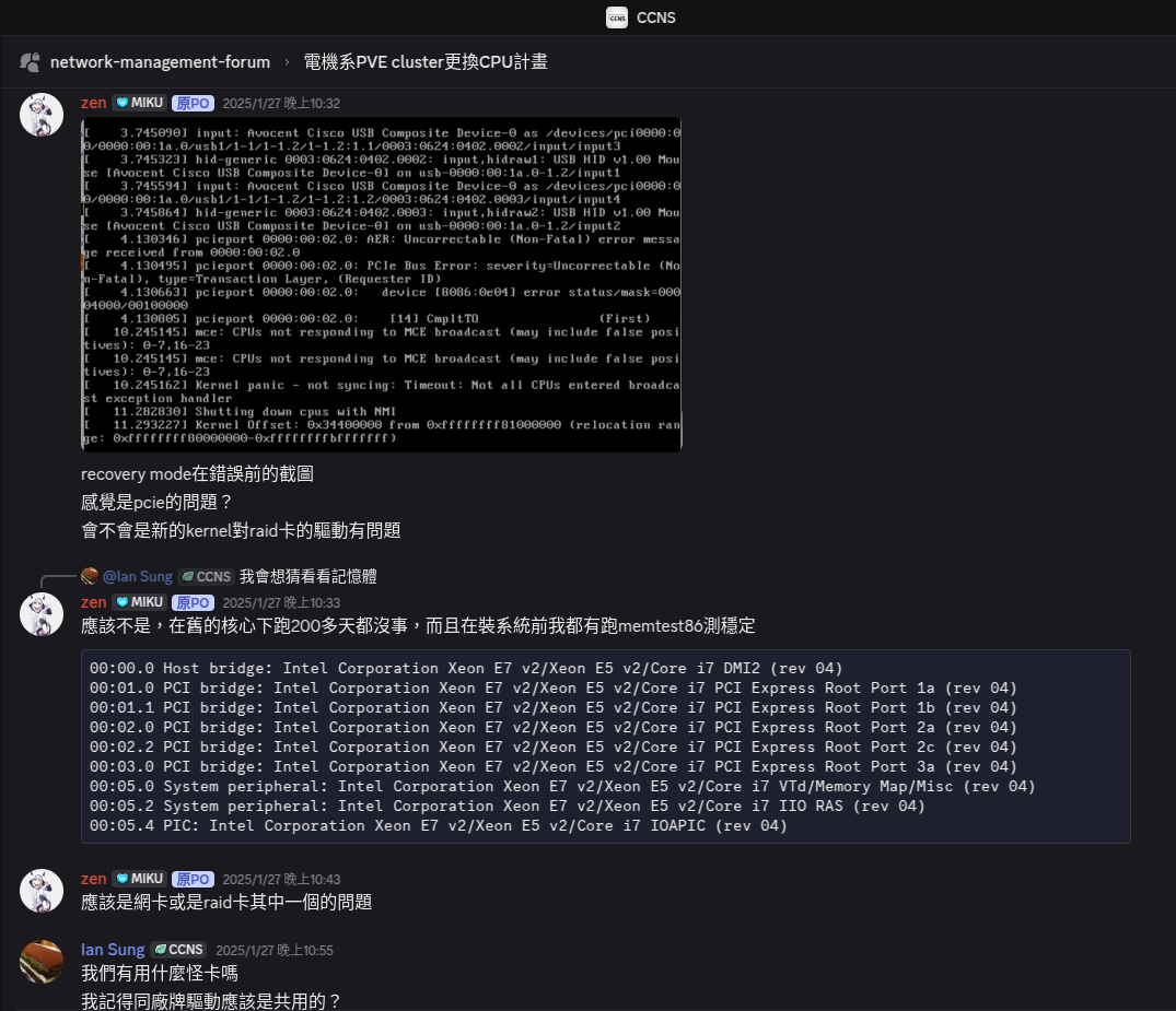 因此第一個推測出現了, CPU 出問題了,或是 CPU 有不相容,實際上 E5-2650 和 E5-2620 的架構的確略有差異,當時猜測可能是因為這個原因引起更新到新核心才出的問題