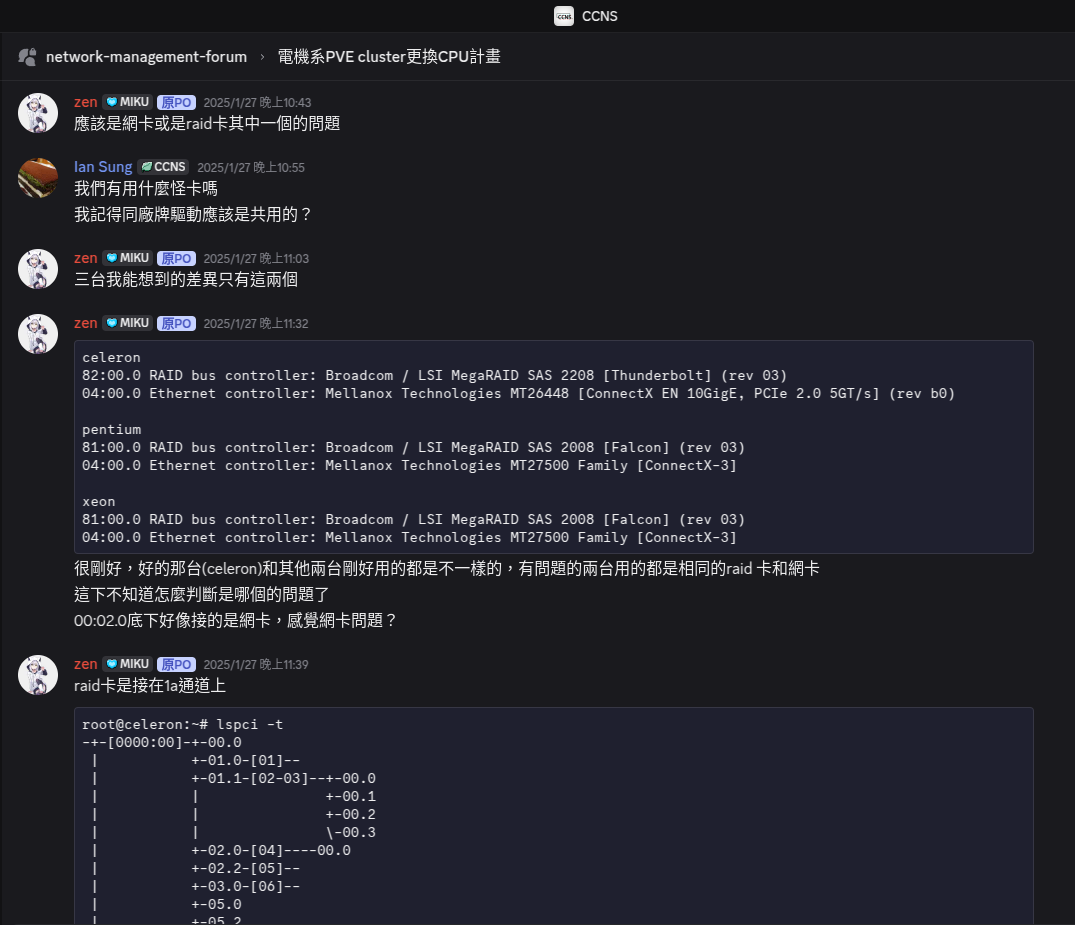 不過雖然認為 PCI bridge 沒有問題,但是錯誤日誌都已經寫了 pcieport 了,我就往 PCIE 的部分開始調查,就發現了三台 Node 的配置不止是 CPU 有不同,連 Raid 卡和網卡也有不同(圖一)