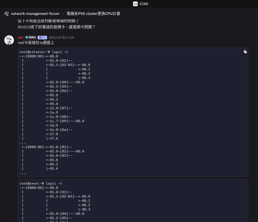 使用lspci -t來查看 PCIE 的連接拓撲,在正常的機器上(celeron)發現 Raid 卡(82:00.0)是接在80.01.02a 通道的 PCI bridge 底下,而網卡(04:00.0)則是接在另一顆 CPU 2a 通道的 PCI bridge(00:02.0)下(圖二)