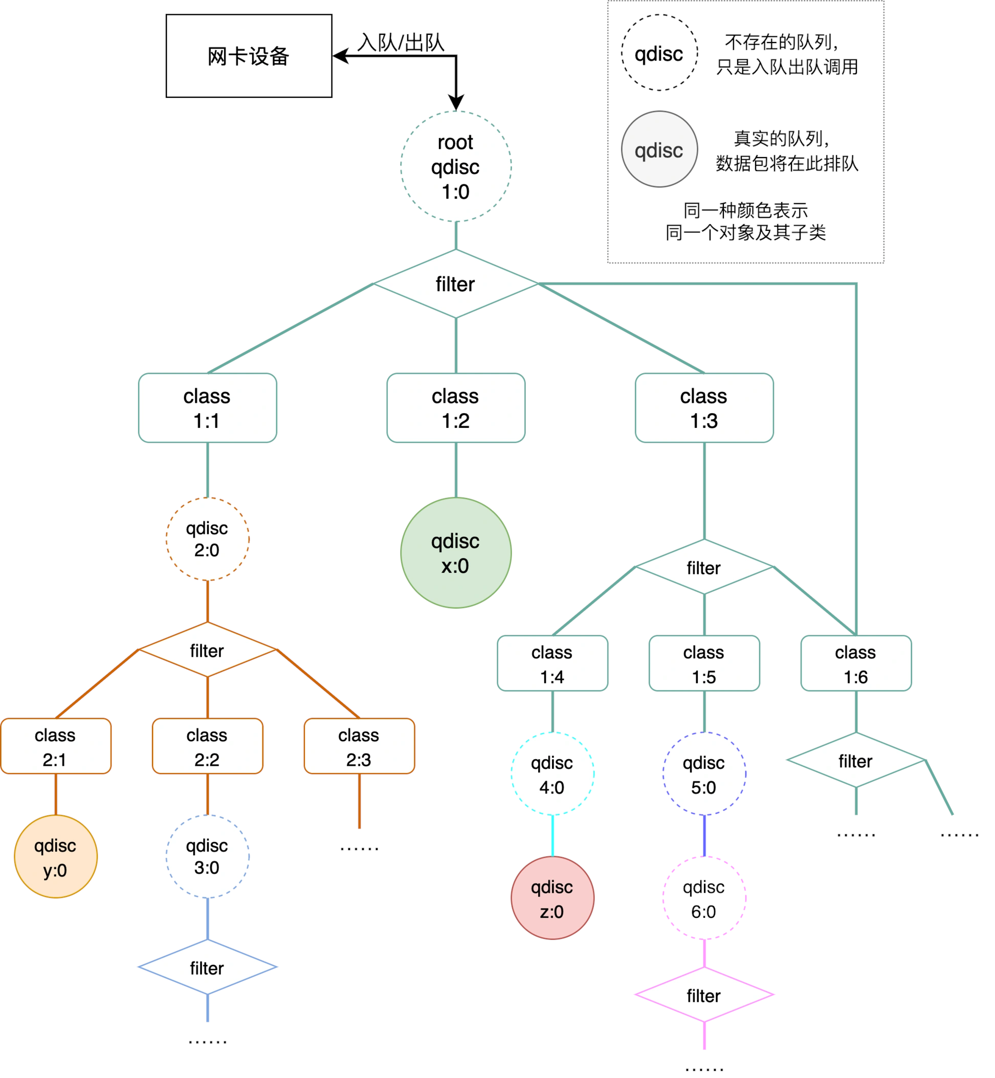 每個網路設備只會有一個根(root)的隊列規則(qdisc),而 qdisc 又分為無類規則(Classless Qdisc)和有纇規則(Classful Qdisc)。