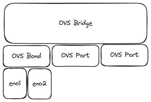 OVS 同樣也可以使用 Bond,但是不能與 Linux Bond 混用,需要使用 OVS Bond 建立,結構類似於這樣, OVS Bond 類似於 OVS Port