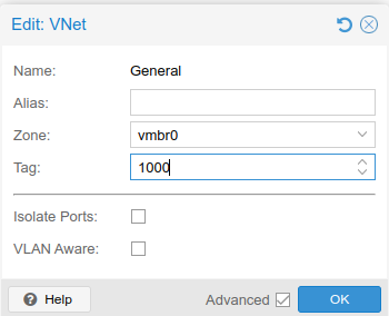接著新增 VNet,這些 VNet 就是可以被虛擬機選擇的網路,設定好 vlan tag 後,機器直接選擇 VNet 就相當於直接接入 Bridge 的 access port,不用再次填寫 vlan tag,注意名字最長只能有8個字元