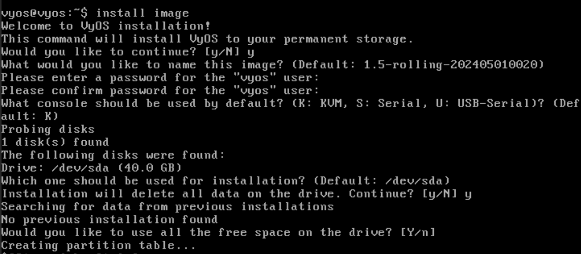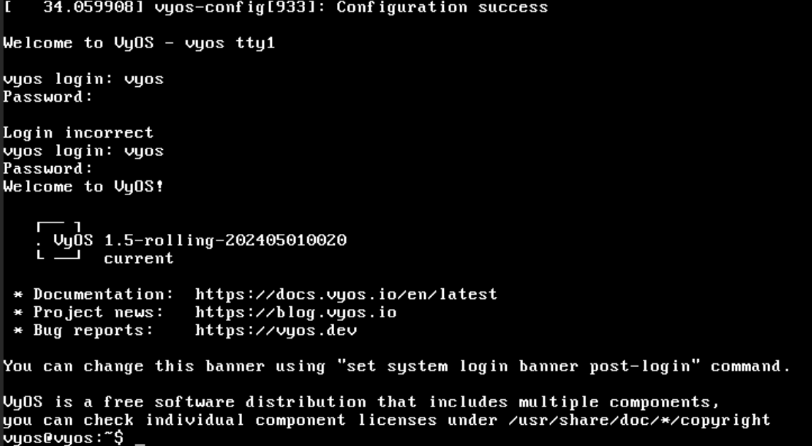 # # 設定hostname # set system host-name <hostname> # # 設定系統時區 # set system time-zone Asia/Taipei # # 建立新的使用者 # set system login user <user> authentication plaintext-password <password> # # 刪除預設vyos的帳號 # delete system login user vyos # # 設定新帳戶的ssh金鑰 # set system login user <user> authentication public-keys <user@host> type <ssh-rsa/ssh-ed25519> # set system login user <user> authentication public-keys <user@host> key <text>