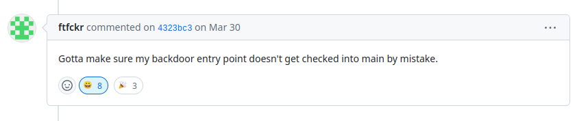 在 C 的專案中,有些檔案只存在於 tarball,在 git 中不存在是正常的,因為下游的使用者不需要去知道怎麼用 autotools 和 autoconf,不過攻擊者利用了這個慣例,沒有將開啟後門的關鍵放入 git 中